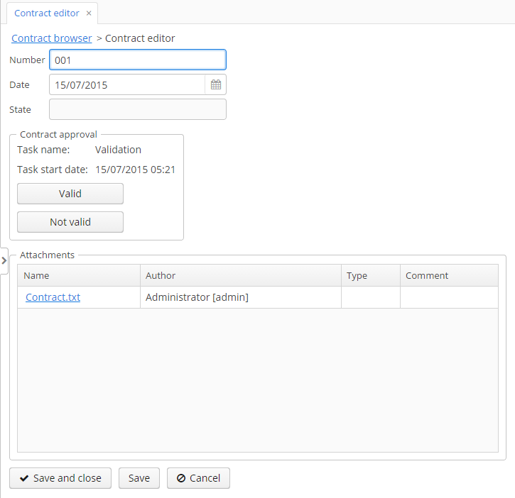 Видим, что для пользователя norman есть одна задача Validation по процессу Contract approval. Выделите ее и нажмите кнопку Open entity editor - откроется экран редактирования договора.